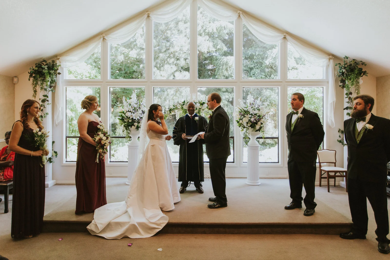 While getting ready Carlie had an entourage including her Mom, Aunts and bridesmaids. Rodney meanwhile had his brother and best friend to keep him on track and on time. After Carlie was all dressed up and ready to go we banished everyone from the chapel and did their first look. Rodney was blown away by Carlie all done up in her Mom's wedding dress. It was a sweet moment.